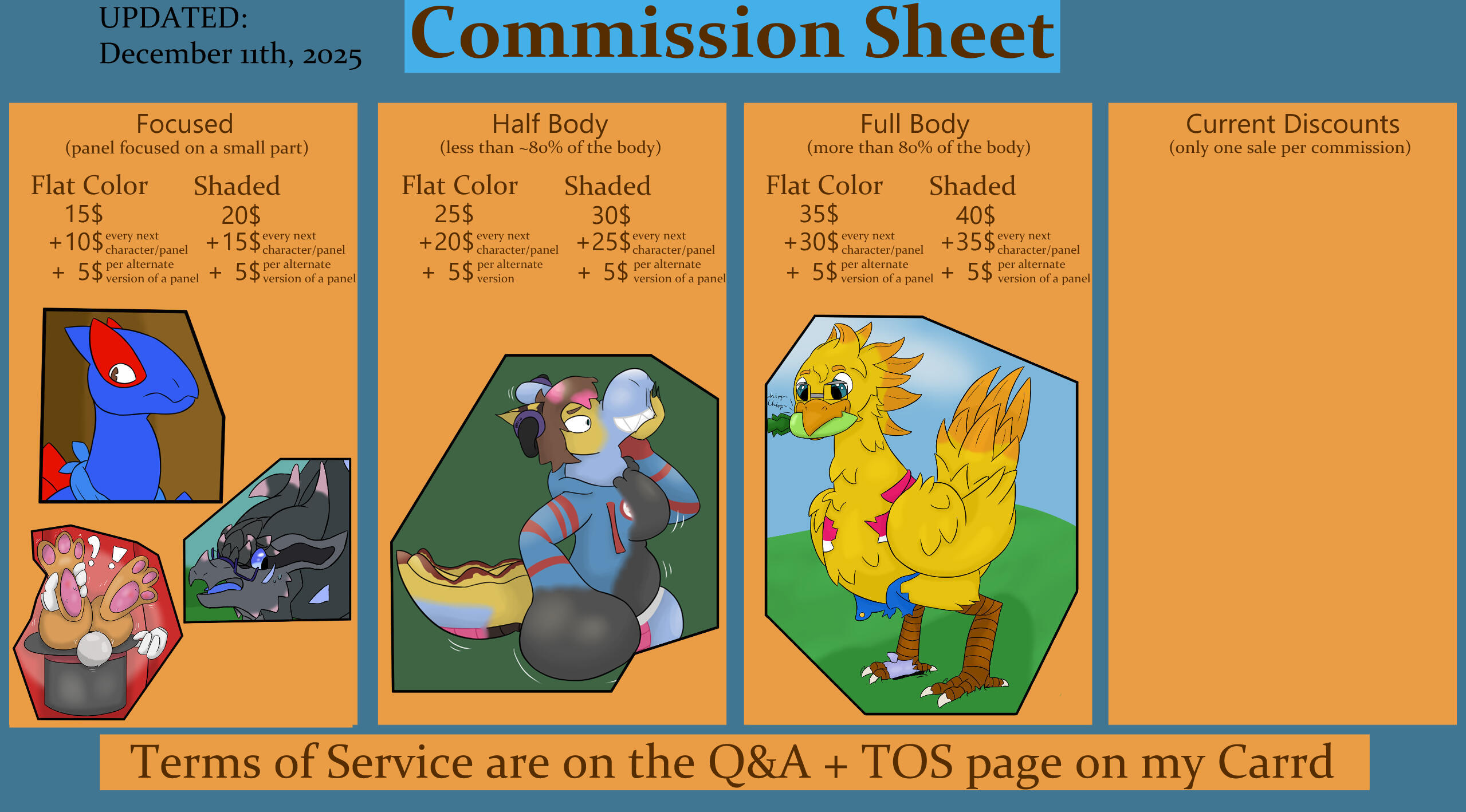 Prices of my commissions can change so always check the Prices tab on my Carrd before you commission me. Pricing Sheet has the update date in the top left corner of the page.